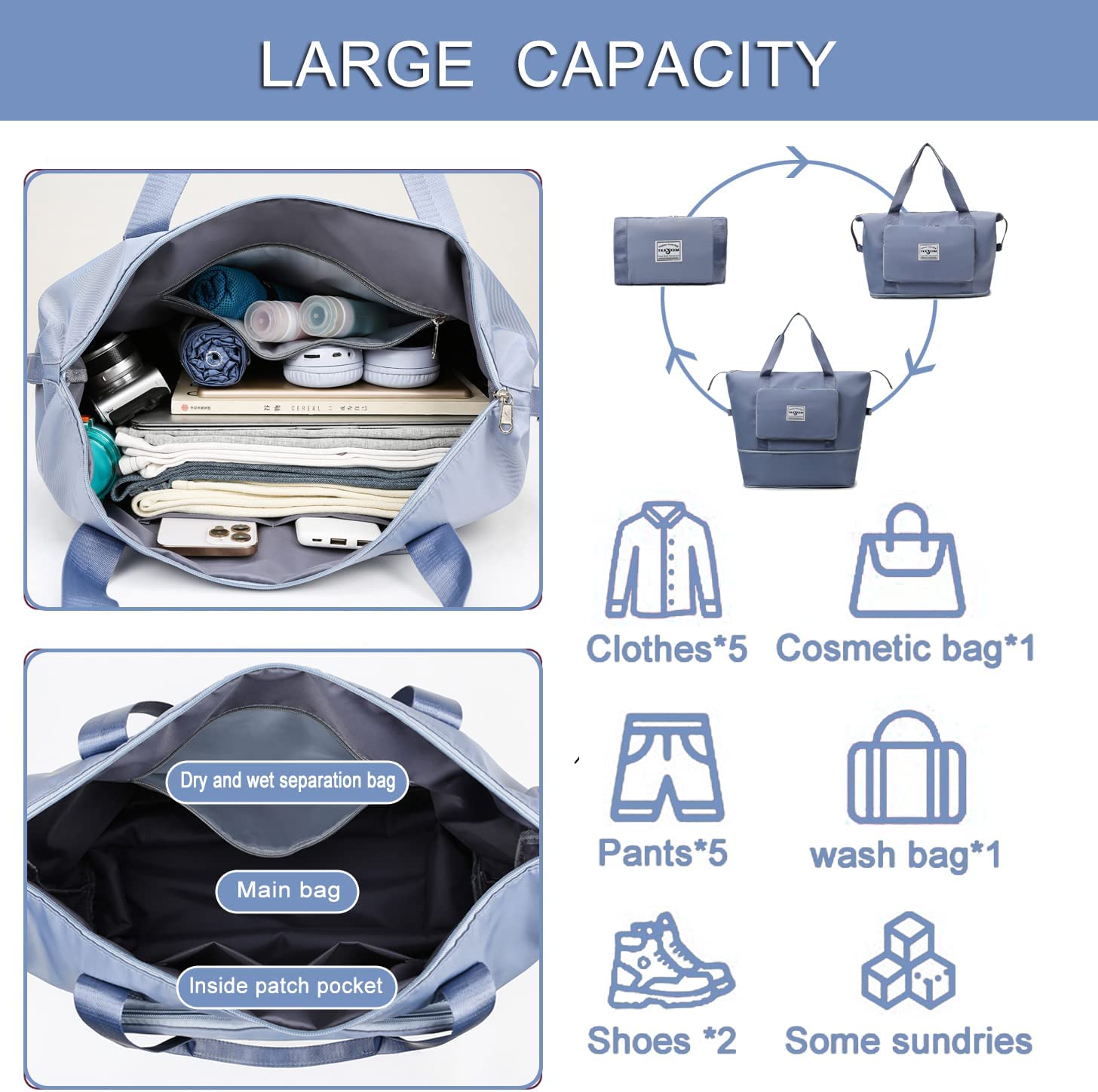 FOLDABLE TRAVEL BAG: The new folding travel bag is made of lightweight oxford cloth, it has excellent waterproof effect in rainy and wet conditions. You can also fold it up, about the size of a handbag.