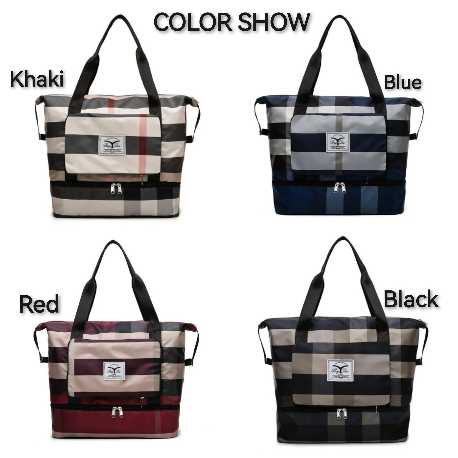 FUNCTIONAL PARTITION TOTE BAG: The large tote bag has internal functional partitions. Put toiletries in the side wet pockets to keep clothes dry in the main pocket. Put shoes in the shoe compartment to prevent soiling of other items.